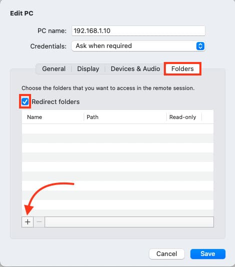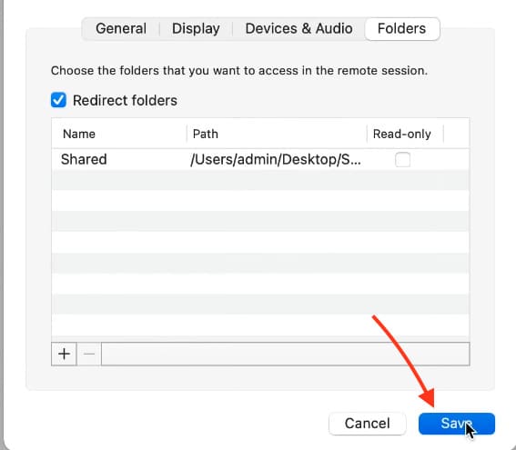 4. Click + to add a shared folder. For example, create a folder on your desktop named Shared.