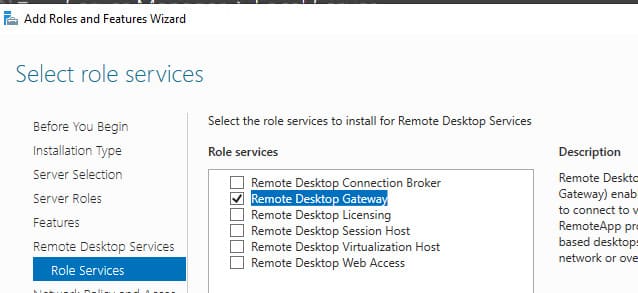 Вы можете установить роль Remote Desktop Gateway через Server Manager (Add roles & Features -> Server Role -> Remote Desktop Services) или с помощью PowerShell.