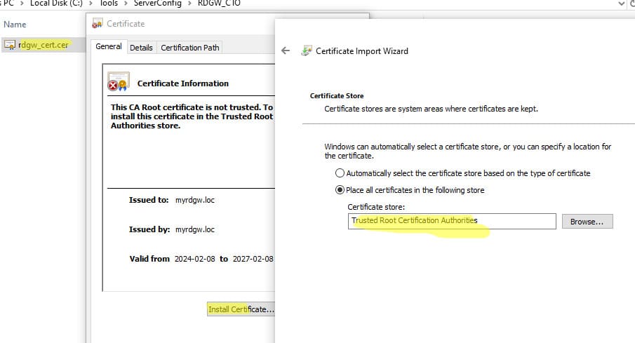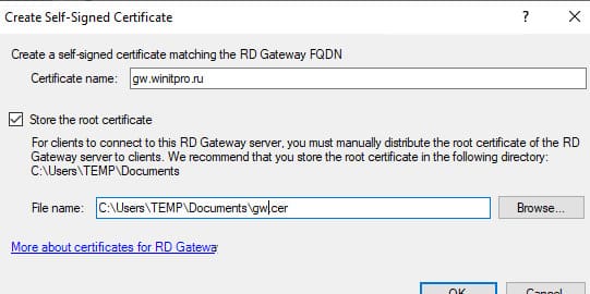 Этот сертификат нужно установить на клиенте. Если клиент не доверяет сертификату RD Gateway, он не сможет подключиться к шлюзу.