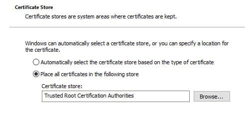 Вы можете установить сертификат вручную. Установить сертификат в Trusted Root Certification Authorities.