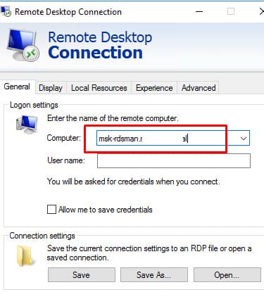 3. На вкладке General укажите имя хоста RDSH, фермы или компьютера, к которому вы хотите подключиться по RDP.