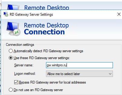 5. Выберите опцию Use these RD Gateway server settings и укажите внешнее DNS имя по которому доступен ваш RDGW сервер (напоминаю, что это имя должно быть указано в сертификате).Если вы используете нестандартный порт для RDGW, его нужно указать после имени сервера через двоеточие, например: