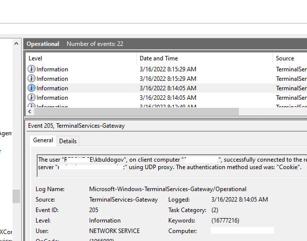 При успешном подключении пользователя через RDGW в журнале появится событие с Event ID 205 от источника TerminalServices-Gateway