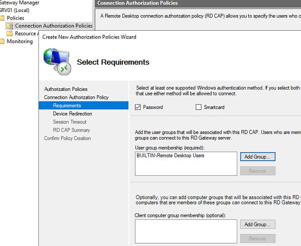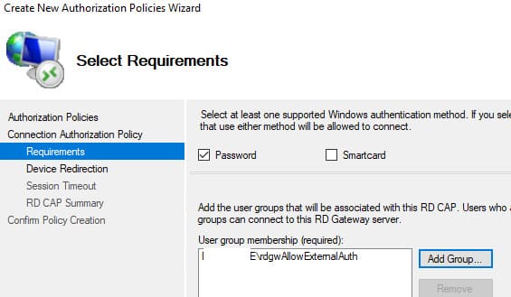3. Выберите тип аутентификации (по паролю или по смарт-карте), укажите группу пользователей, которым разрешено аутентифицироваться на RDGW.