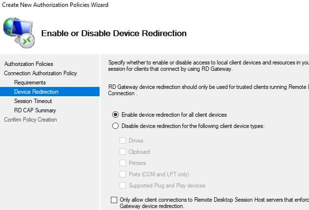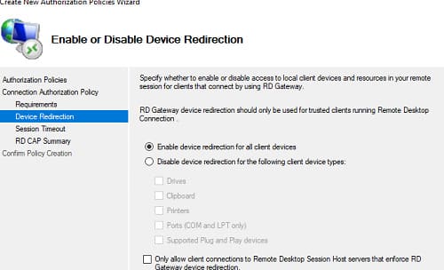 3. Выберите какие устройства разрешено перенаправлять в RDP сессию клиентам (по умолчанию разрешено перенаправлять все, включая принтеры, локальные диски и буфер обмена в RDP);