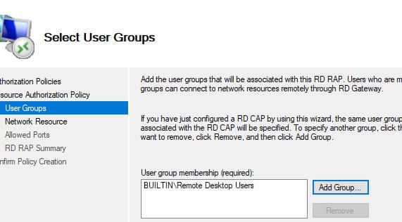 4. После этого создайте новую Resource Authorization Policy (RAP). Разрешите подключения для группы BUILTIN\Remote Desktop Users
