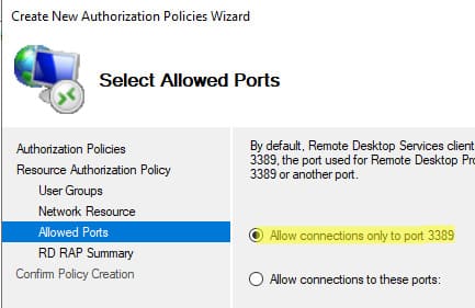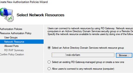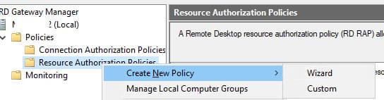 1. В консоли RD Gateway Manager выберите Policies -> Resource Authorization Policies и выберите Create New Policy -> Wizard.