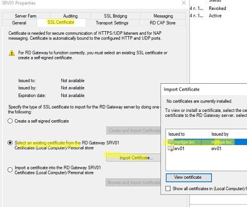 8. Откройте свойства сервера RDGW, перейдите на вкладку SSL Certificates -> Select an existing certificate from the RD Gateway Certificates Local/Personal Store -> Import Certificate. Выберите созданный вами сертификат.