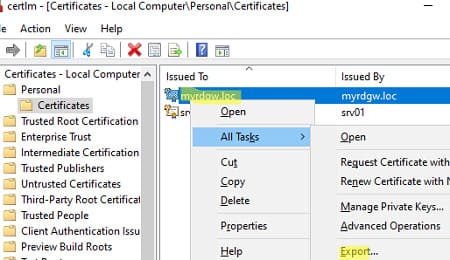 9. Теперь можно настроить подключение на клиенте. В первую очередь надо экспортировать с сервера RDGW сертификат.