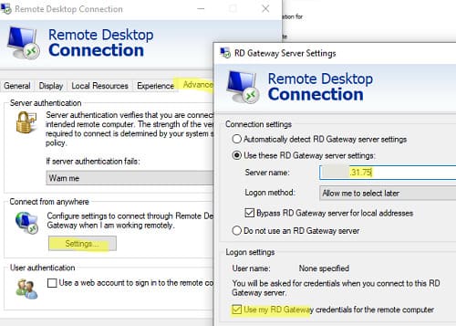 10. Теперь откройте клиент mstsc и настройте подключение через Remote Desktop Gateway. Укажите имя или IP адрес хоста RDGW в разделе Advanced -> Settings -> Use these RD Gateway settings.