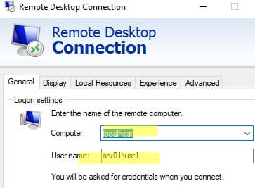 11. В качестве имени RDP хоста укажите localhost и имя пользователя для подключения в формате rdssrv01\user1 , где rdssrv01- локальное имя компьютера (hostname) Windows Server с ролью RDS.