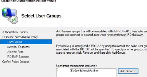 – rdgwExtUsers — группа пользователей, которым разрешено аутентифицироваться на RDGW;