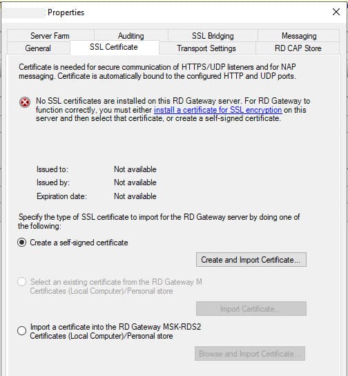 1. Откройте свойства RD Gateway в консоли RD Gateway Manager и перейдите на вкладку SSL Certificate.