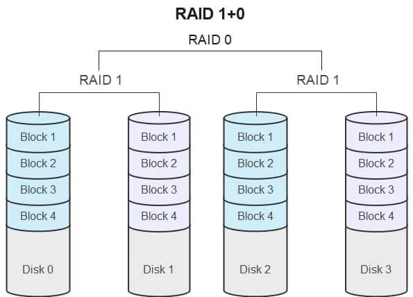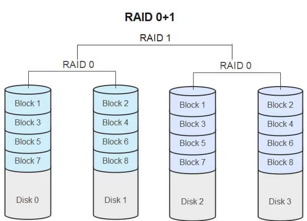 RAID 01: Также известный как RAID 0 + 1, это уровень RAID, который сочетает в себе зеркалирование и чередование данных, обеспечивая как репликацию, так и совместное использование данных между дисками. Он обладает той же полезной емкостью, что и массив RAID 1, с зеркальной конфигурацией полос, называемой «вложенными уровнями RAID».