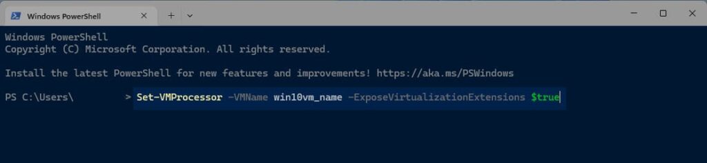 Set-VMProcessor -VMName win10vm_name -ExposeVirtualizationExtensions $true