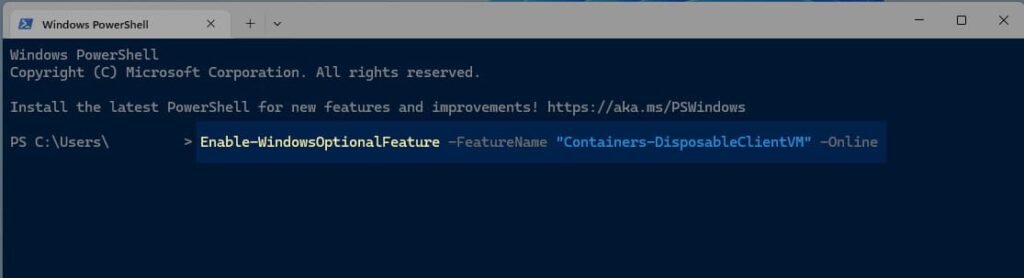 Enable-WindowsOptionalFeature -FeatureName "Containers-DisposableClientVM" –Online