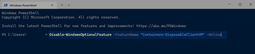 Disable-WindowsOptionalFeature –FeatureName "Containers-DisposableClientVM" -Online