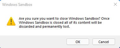 “Are you sure you want to close Windows Sandbox? Once Windows Sandbox is closed all of its content will be discarded and permanently lost.”